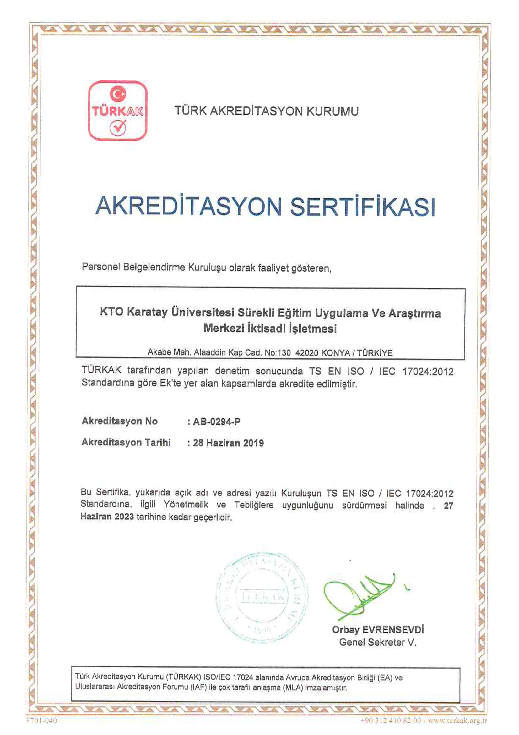 Yetkilendirilmiş Belgelendirme Kuruluşu; Türk Akreditasyon Kurumu (TÜRKAK) tarafından ya da Avrupa Akreditasyon Birliği bünyesinde çok taraflı tanıma anlaşması imzalamış başka akreditasyon kurumlarınca ilgili ulusal yeterliliklerde TS EN ISO/IEC 17024 standardına göre akredite edilmiş, Mesleki Yeterlilik Kurumu (MYK) tarafından yapılan inceleme, denetim ve değerlendirme sonucunda ulusal yeterliliklere göre sınav ve belgelendirme faaliyetlerini yürütmek için gerekli şartları sağladığı tespit edilen personel belgelendirme kuruluşudur.”