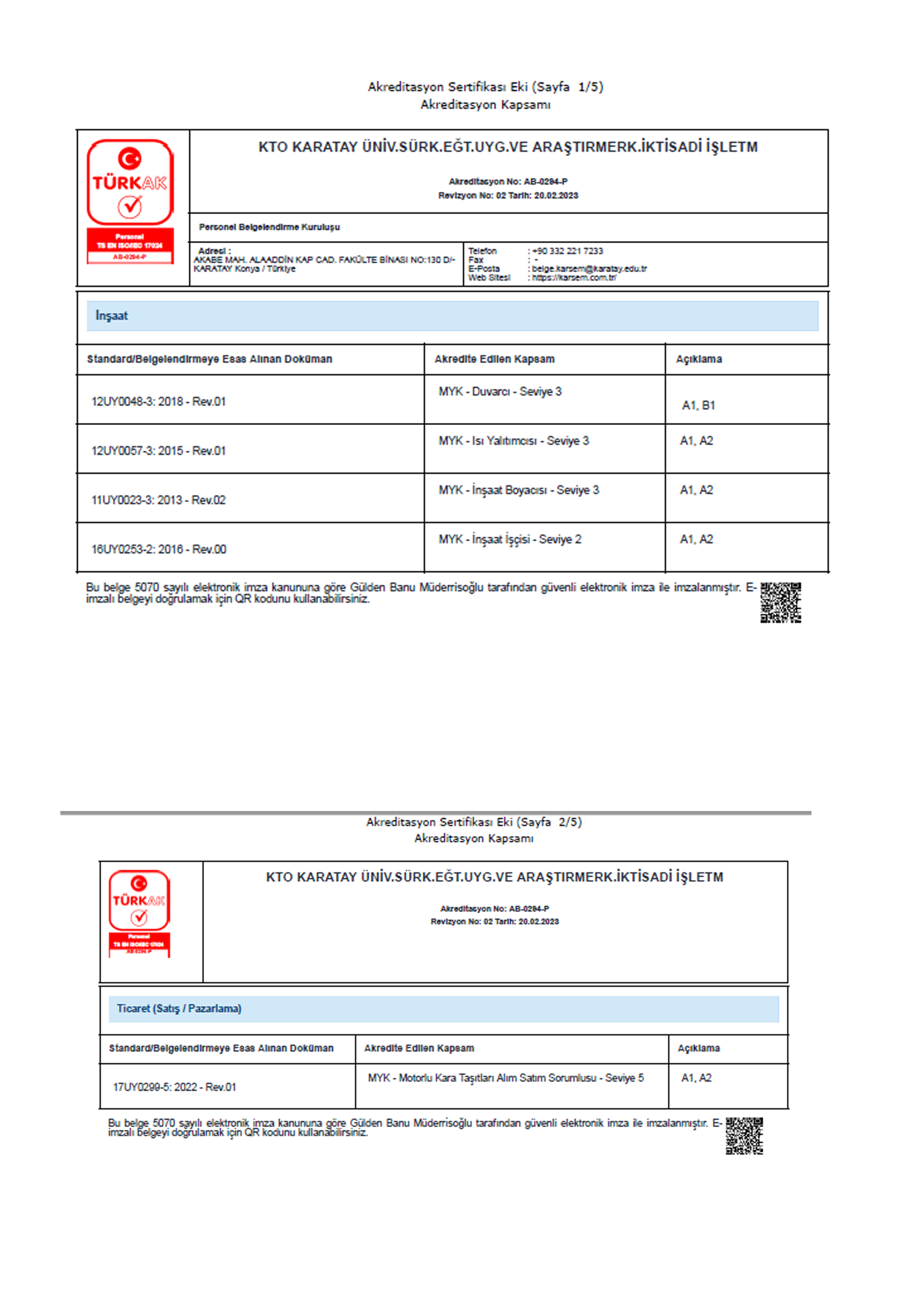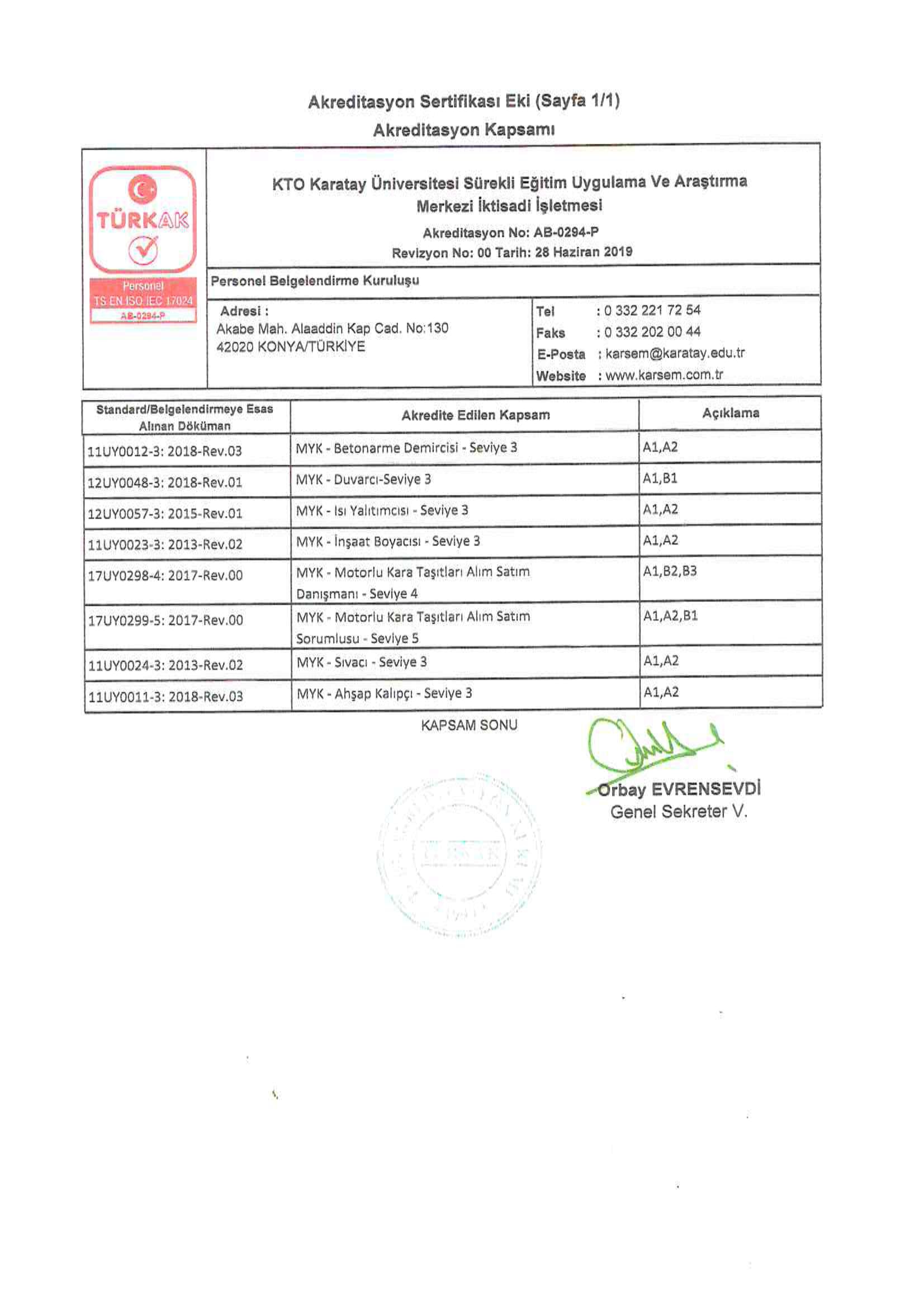 Yönetim Kurulu karar tarihi itibariyle kapsamımızda bulunan aşağıdaki ulusal yeterliliklerde