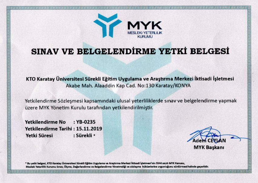 Mesleki Yeterlilik Kurumu Yönetim Kurulunun 24/01/2024 tarih ve 2024/15 sayılı kararı ile sınav ve belgelendirme yetkimiz kendi talebimiz doğrultusunda aşağıdaki ulusal yeterliliklerde kaldırılmıştır.